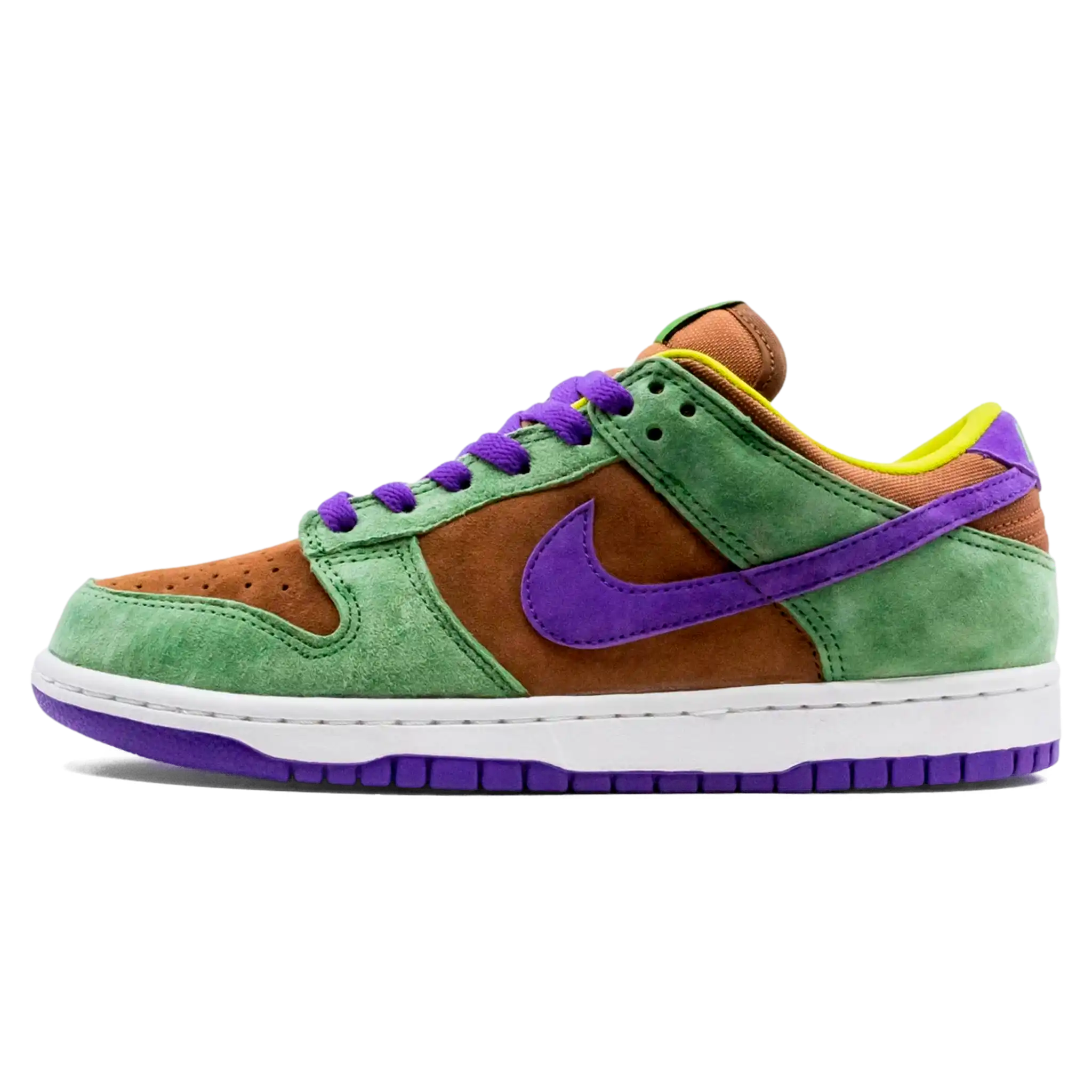Após o lançamento do Nike Dunk Low Plum em 2020, o Nike Dunk Low Veneer resgata completamente o pacote Ugly Duckling CO.JP de 2001. Este Dunk apresenta camurça premium em tons de marrom, verde e roxo, recriando a estética nostálgica da edição original de 2001. A língua de malha, o logotipo bordado da Nike no calcanhar e a sola branca e roxa adicionam toques finais a este clássico cult.